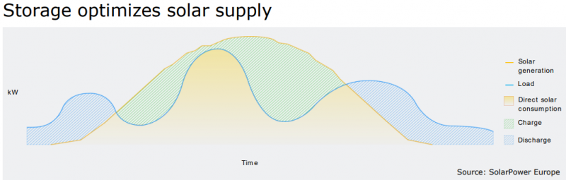 首先,我們從光伏發(fā)電特點(diǎn)和電網(wǎng)用電特點(diǎn)來看。圖一黃色的光伏發(fā)電曲線的計(jì)算模型中,僅有部分與用電曲線重合。裝配儲能系統(tǒng)后,當(dāng)光伏發(fā)電量大于用電量,儲能處于充電狀態(tài);當(dāng)用電量大于光伏發(fā)電量,儲能處于放電狀態(tài)。儲能系統(tǒng)充當(dāng)了一個很好的“能源調(diào)節(jié)器”,從而解決了“棄光”這個問題
