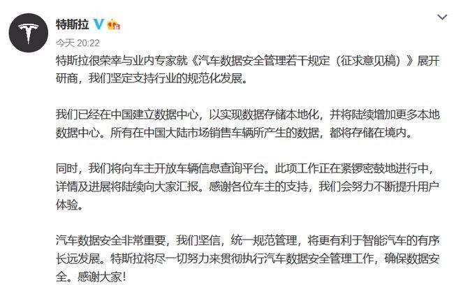 5月25日,特斯拉宣布已經(jīng)在中國建立了數(shù)據(jù)中心,將實(shí)現(xiàn)數(shù)據(jù)存儲本地化,并將陸續(xù)增加更多本地?cái)?shù)據(jù)中心。所有在國內(nèi)市場銷售的車輛所產(chǎn)生的數(shù)據(jù)都將存儲在境內(nèi)。