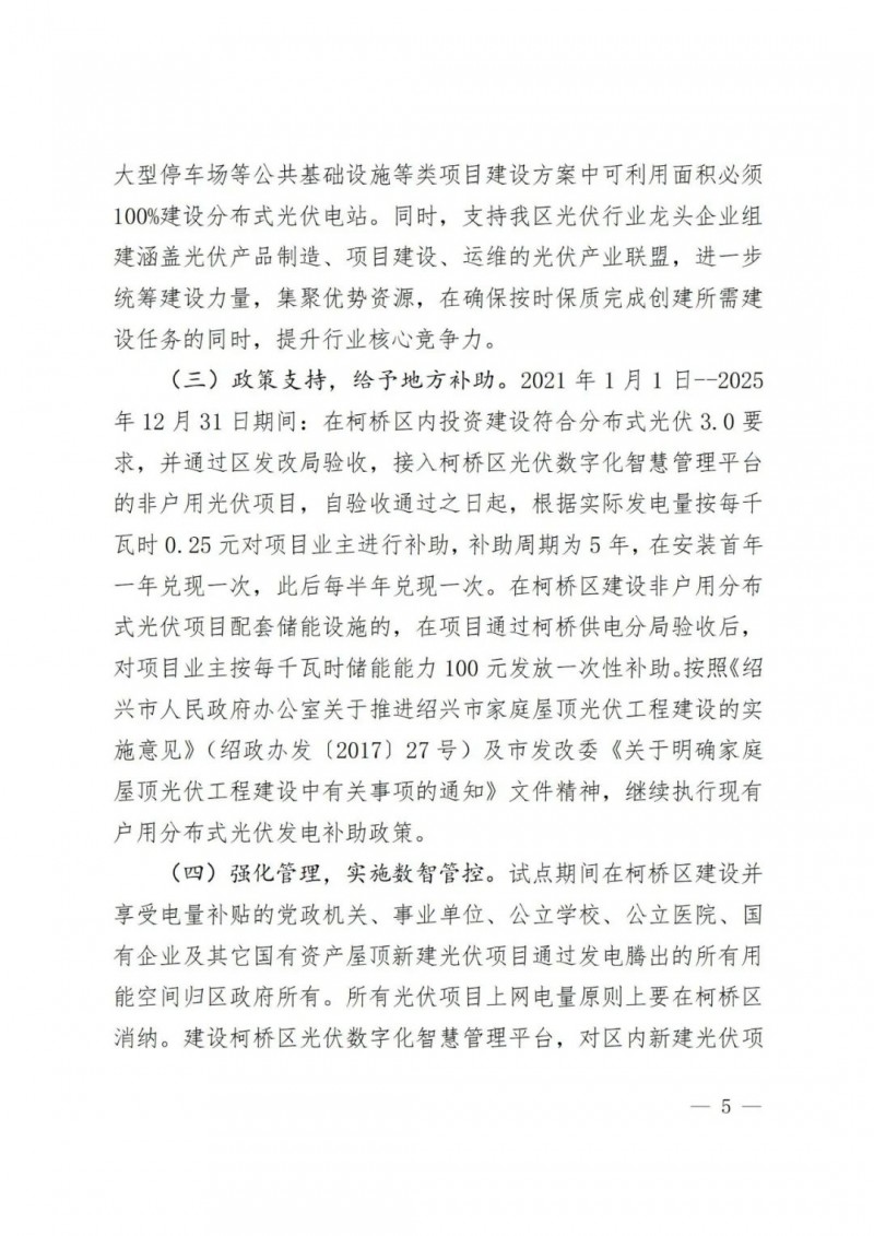 政策方面給予一定的地方補(bǔ)助,2021年1月1日--2025年12月31日期間:在柯橋區(qū)內(nèi)投資建設(shè)符合分布式光伏3.0要求,根據(jù)實(shí)際發(fā)電量按每千瓦時(shí)0.25元對(duì)項(xiàng)目業(yè)主進(jìn)行補(bǔ)助,補(bǔ)助周期為5年,在安裝首年一年兌現(xiàn)一次,此后每半年兌現(xiàn)一次。在柯橋區(qū)建設(shè)非戶(hù)用分布式光伏項(xiàng)目配套儲(chǔ)能設(shè)施的,在項(xiàng)目通過(guò)柯橋供電分局驗(yàn)收后,對(duì)項(xiàng)目業(yè)主按每千瓦時(shí)儲(chǔ)能能力100元發(fā)放一次性補(bǔ)助。