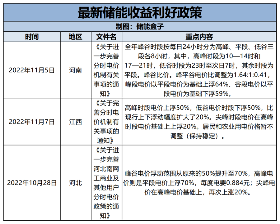 此外,國內(nèi)新能源發(fā)電發(fā)展較為積極的河北、河南、江西等省,也陸續(xù)出臺了大幅利好儲能收益的新政策。最直觀的政策類型就是拉大峰谷電價差,提升電價水平,儲能主要收益大幅提升。