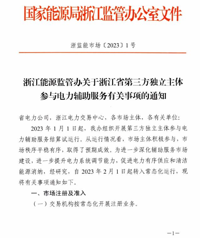2月1日,國家能源局浙江能源監(jiān)管辦發(fā)布了關(guān)于浙江省第三方獨(dú)立主體參與電力輔助服務(wù)有關(guān)事項(xiàng)的通知。