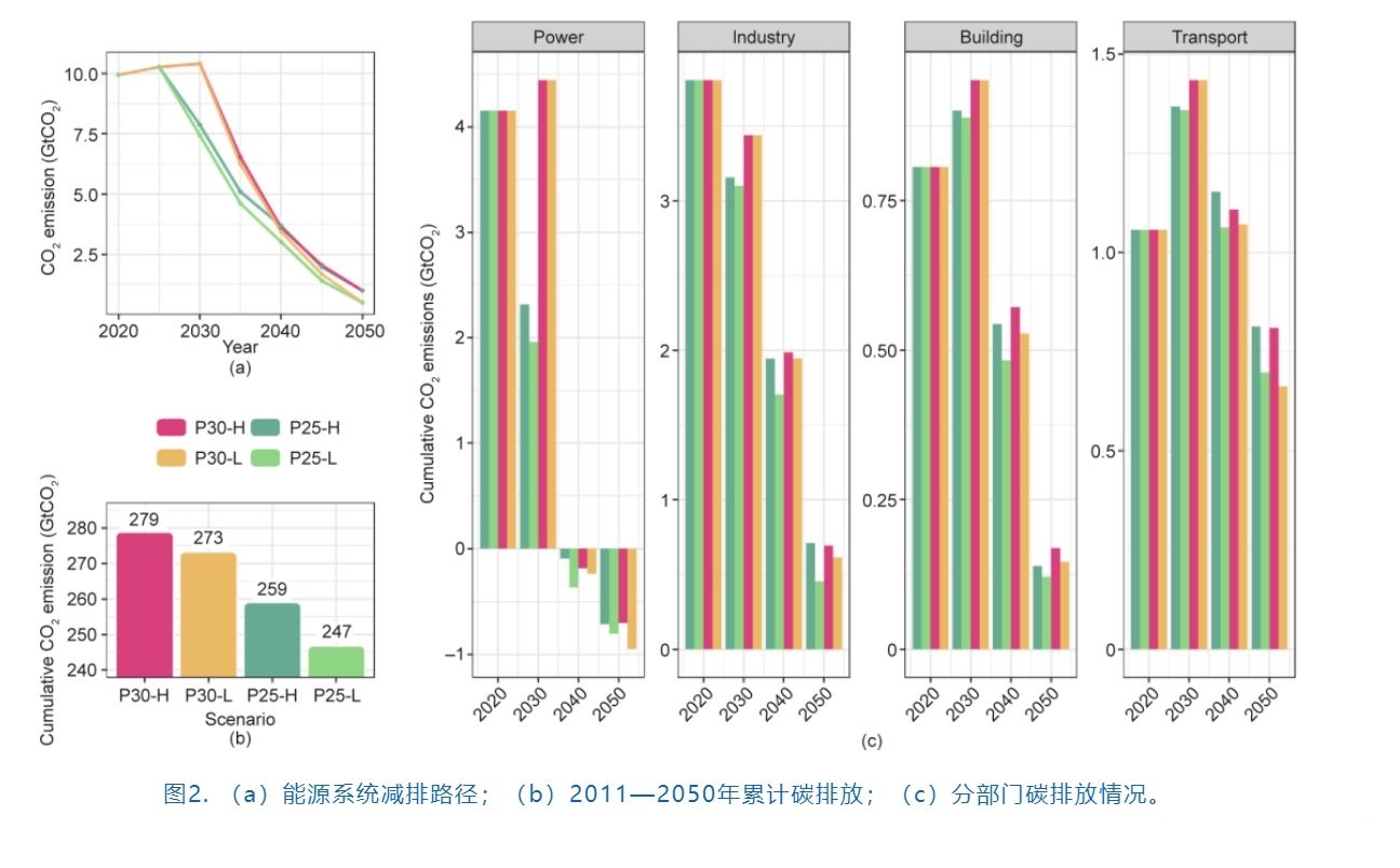 通過多情景比較發(fā)現(xiàn),提前達(dá)峰能夠給中國更多的時(shí)間來安排煤電廠的有序退役和可再生能源的平穩(wěn)部署。雖然提前達(dá)峰在短期內(nèi)可能會(huì)有更大的轉(zhuǎn)型壓力,但從長遠(yuǎn)來看,這是最具有成本效益的選擇。同時(shí),提前達(dá)峰帶來的累計(jì)排放量減少,也將縮小21世紀(jì)下半葉對于負(fù)排放的大量需求。盡管4個(gè)情景2050年局地空氣污染物的排放差異不大,但是提前實(shí)現(xiàn)碳達(dá)峰將導(dǎo)致未來15年的空氣質(zhì)量得到明顯改善。2050年更低的排放值會(huì)增加整體的減排壓力,這將導(dǎo)致可再生能源和負(fù)排放技術(shù)的進(jìn)一步擴(kuò)張。需求部門在能源轉(zhuǎn)型中也將通過減少能源需求(但增加福利損失)、使用高成本技術(shù)(大規(guī)模使用氫能)等策略來應(yīng)對更為嚴(yán)格的排放約束。