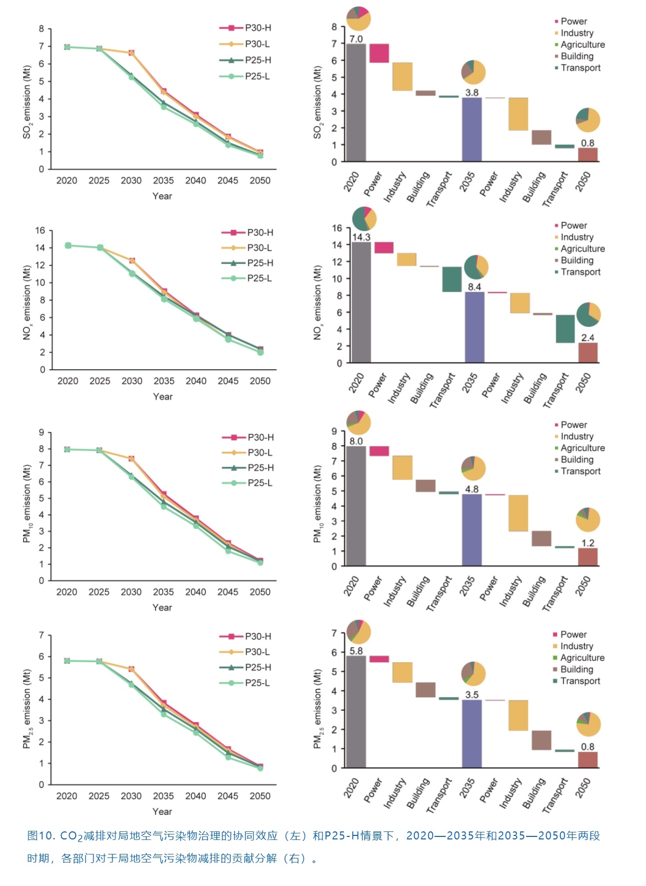 對比不同情景,在2025—2035年,上述4種局地污染物的排放在碳達(dá)峰時(shí)間不同的情景下會(huì)有明顯的不同。與P30情景相比,P25情景在2030年的SO2、NOx、PM10、PM2.5排放分別減少21%、12%、15%和14%。因此,盡管不同情景下2050年的排放趨于一致,盡早開始碳減排都將產(chǎn)生更多的近期收益。