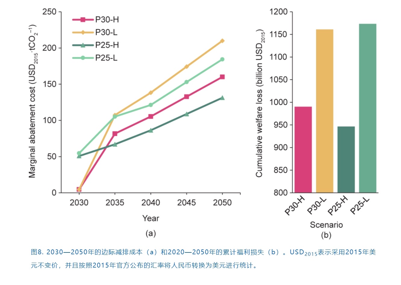 福利損失是另一個(gè)用于衡量轉(zhuǎn)型成本的指標(biāo)。MAC關(guān)注的是減排的難度,而福利損失衡量了減排對于消費(fèi)者和生產(chǎn)者產(chǎn)生的影響。圖8(b)顯示,相較于僅實(shí)現(xiàn)國家自主貢獻(xiàn)目標(biāo)的基準(zhǔn)情景,在2020—2050年,碳中和情景的累計(jì)福利損失為0.947~1.173萬億美元。2050年碳預(yù)算較低的情景(P25-L和P30-L)的福利損失將比另外兩個(gè)情景高17%~24%,而達(dá)峰時(shí)間對于福利損失和能源服務(wù)需求的變化影響較小。
