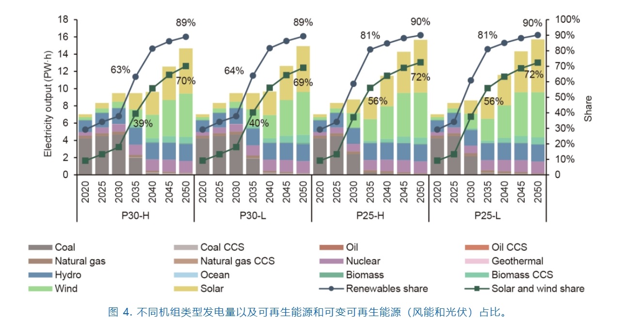 發(fā)電結(jié)構(gòu)的變化主要是因?yàn)槊弘姀S的退役和風(fēng)能及光伏發(fā)電的增加??梢灶A(yù)計(jì),煤電廠將很快進(jìn)入轉(zhuǎn)型最關(guān)鍵的10年。在此期間,煤電廠要么需要提前退役,要么將進(jìn)行靈活性改造以進(jìn)入輔助服務(wù)市場,或者轉(zhuǎn)變?yōu)樯镔|(zhì)-煤混燃電廠甚至純BECCS電廠,從而能夠產(chǎn)生負(fù)排放。研究表明,碳達(dá)峰的時(shí)間在很大程度上取決于燃煤電廠退出發(fā)電序列的速度。比較P25和P30情景,發(fā)現(xiàn)近期需要盡快停止新建煤電廠并在合理范圍內(nèi)讓落后煤電廠有序退役。到燃煤電廠基本退出后,可再生能源發(fā)電量將占總發(fā)電量的81%,而以風(fēng)能和光伏為代表的可變可再生能源的比例將達(dá)到56%。對于P25情景,風(fēng)能和光伏的總裝機(jī)容量在2035年將達(dá)到3.1 TW,而對于P30情景,風(fēng)能和光伏在2040年的總裝機(jī)容量為3.4 TW。核能將成為電力系統(tǒng)的重要組成部分,未來可再生能源的滲透率會(huì)很高,其裝機(jī)容量將在未來20年增長3倍以上。