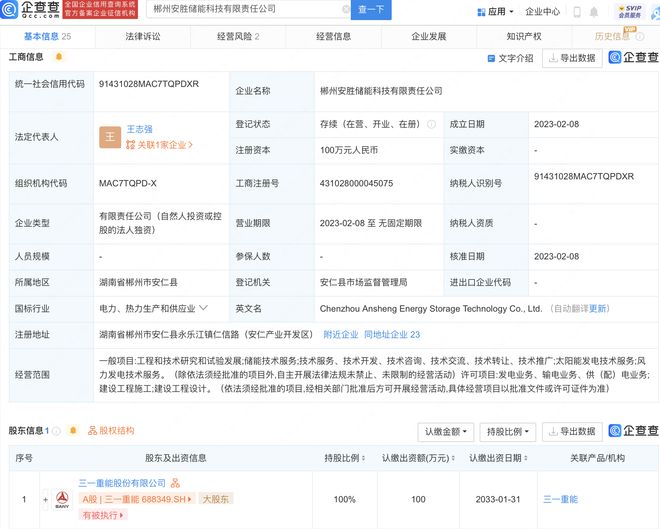 近日,郴州安勝儲(chǔ)能科技有限責(zé)任公司成立,法定代表人為王志強(qiáng),注冊(cè)資本100萬(wàn)元人民幣,經(jīng)營(yíng)范圍包含:儲(chǔ)能技術(shù)服務(wù);太陽(yáng)能發(fā)電技術(shù)服務(wù);風(fēng)力發(fā)電技術(shù)服務(wù)等。企查查股權(quán)穿透顯示,該公司由三一重能100%控股。