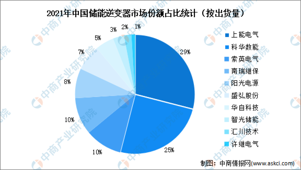 2021年中國(guó)新增投運(yùn)的新型儲(chǔ)能項(xiàng)目中,裝機(jī)規(guī)模排名前十位的儲(chǔ)能逆變器提供商依次為:上能電氣、科華數(shù)能、索英電氣、南瑞繼保、陽光電源、盛弘股份、華自科技、智光儲(chǔ)能、匯川技術(shù)和許繼電氣。其中,上能電氣、科華數(shù)能市場(chǎng)份額占比分別為29%、25%。