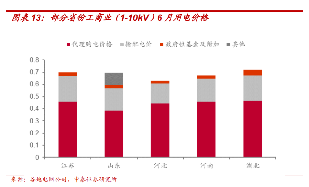 此前,關(guān)于儲能充電是否需承擔(dān)輸配電價等費(fèi)用,各地沒有明確統(tǒng)一的標(biāo)準(zhǔn)?!锻ㄖ诽貏e指出,獨(dú)立儲能電站向電網(wǎng)送電的,其相應(yīng)充電電量不承擔(dān)輸配電價和政府性基金及附加,這一規(guī)定將大幅降低儲能充電成本。我們統(tǒng)計(jì)了部分省份2022年6月代理購電的用電價格,輸配電價和政府性基金及附加合計(jì)占用電價格的比例超過30%,以江蘇省為例,代理購電價格、輸配電價、政府性基金及附加分別為0.4594、0.2110、0.0294 元/kWh,輸配電價及政府性基金占用電價格比例為 34.35%。若儲能充電需支付這兩部分費(fèi)用,將大幅提高充電成本,因此這一規(guī)定將明確儲能項(xiàng)目邊界條件,保障儲能合理收益,提高儲能投資意愿。