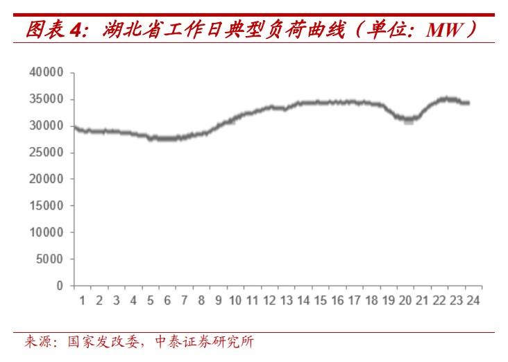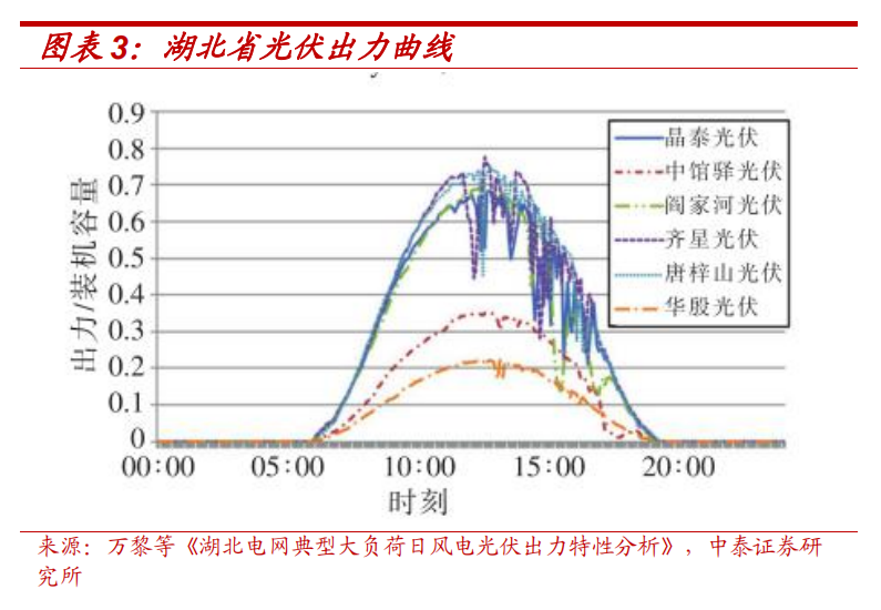 是一天中的最低位。光伏出力曲線和負(fù)荷曲線相對更適配,白天為曲線高位,但以湖北省為例,20時至23時負(fù)荷仍處于相對高位,而此時光伏出力為0。因此當(dāng)新能源發(fā)電量占比達(dá)到一定程度,電源和負(fù)荷的曲線差異將對電網(wǎng)的運(yùn)行效率和安全造成沖擊,或?qū)е麓罅織夛L(fēng)棄光現(xiàn)象。