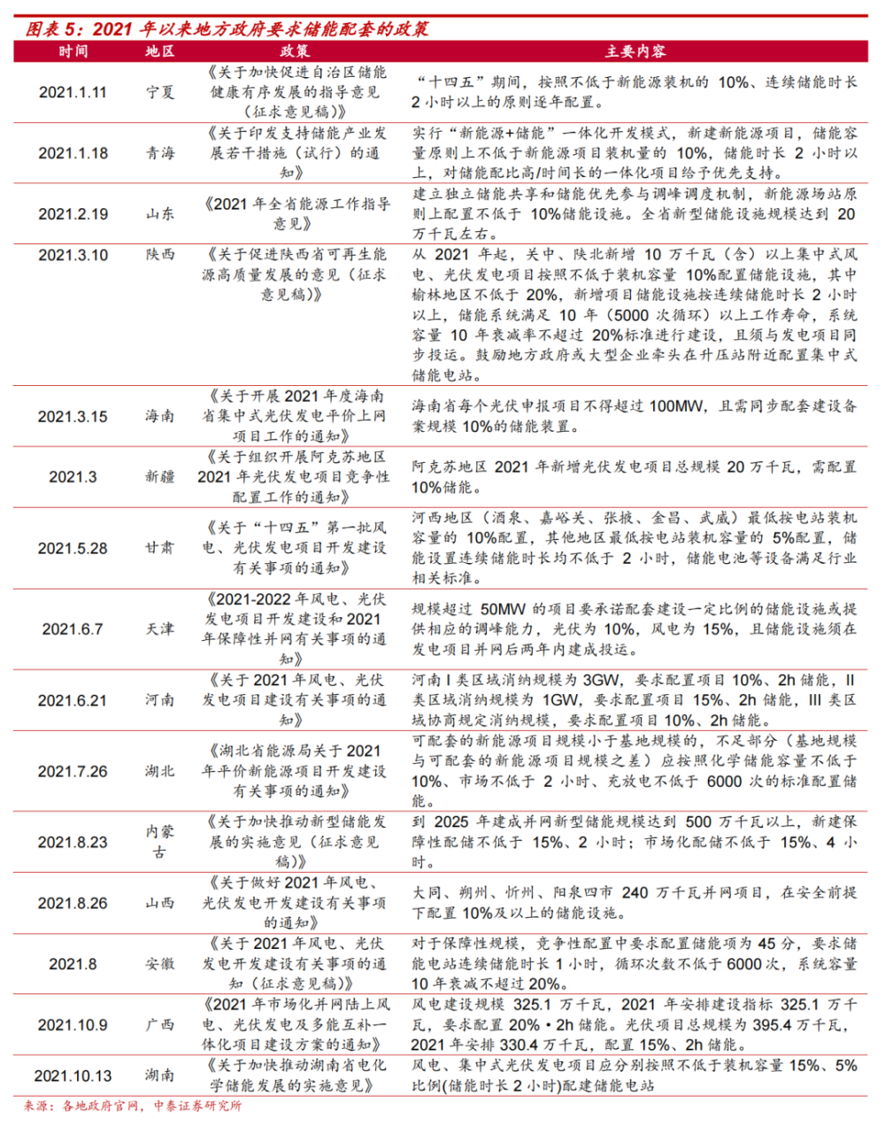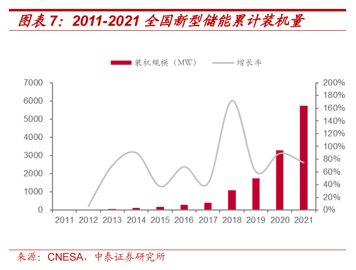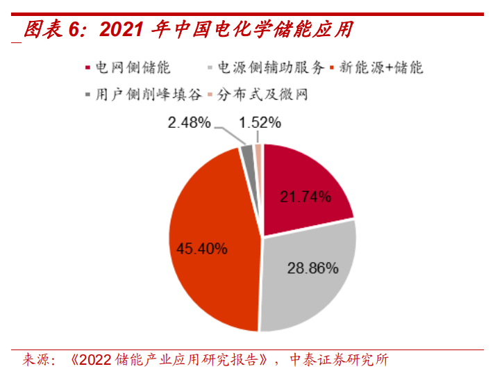 2021年起,各省密集發(fā)布新能源項(xiàng)目配套儲能政策,配臵比例主要在 10%-20%區(qū)間,配臵時長1-2小時,推動我國電化學(xué)儲能高速增長。根據(jù)《2022儲能產(chǎn)業(yè)研究報(bào)告》,2021年我國新能源配儲占電化學(xué)儲能應(yīng)用的45.40%,我國電化學(xué)儲能主要應(yīng)用在電源側(cè)和電網(wǎng)側(cè)來支持風(fēng)光新能源消納和新型電力系統(tǒng)建設(shè)。