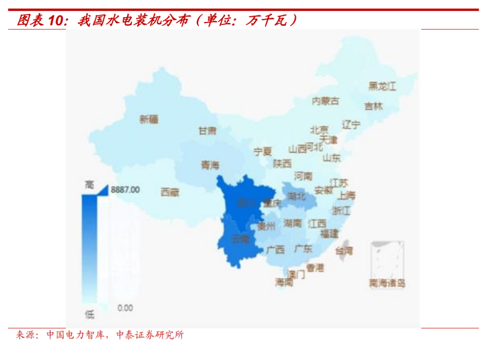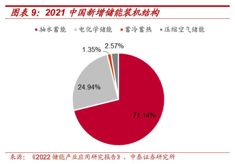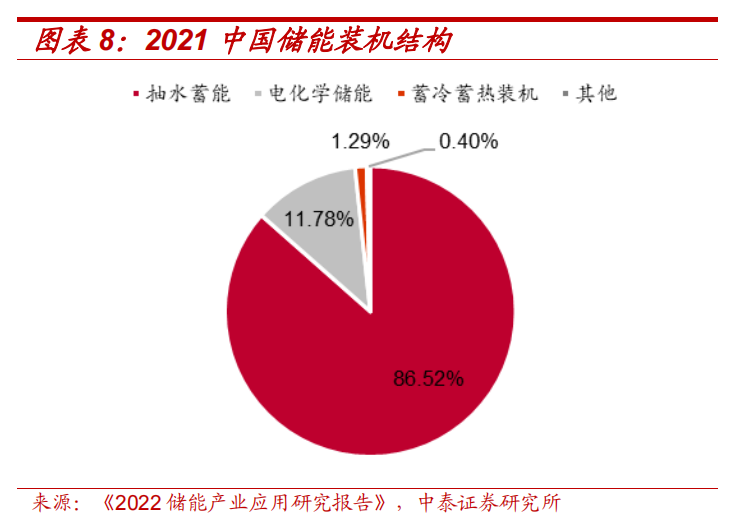 2021年中國抽水蓄能裝機(jī)功率38GW,占比全部儲能的86.52%,電化學(xué)儲能裝機(jī)功率5GW,占比11.78%,抽水蓄能是我國存量儲能的主要形式。2021年中國新增抽水蓄能裝機(jī)5GW,占比71.14%,電化學(xué)儲能新增2GW,占比24.94%,電化學(xué)儲能裝機(jī)增速超過抽水蓄能。抽水蓄能需要尋找合適地形及水域,同時可能涉及搬遷移民問題,外部限制因素較多,建設(shè)期通常長達(dá)數(shù)年。我國水電資源主要集中在南方地區(qū)尤其是西南地區(qū),西北等地區(qū)缺發(fā)建設(shè)大型抽蓄配套新能源的條件。而電化學(xué)儲能則對外界條件要求不高,建設(shè)期較短,單體投資小,因而成為新能源配儲的普遍選擇。