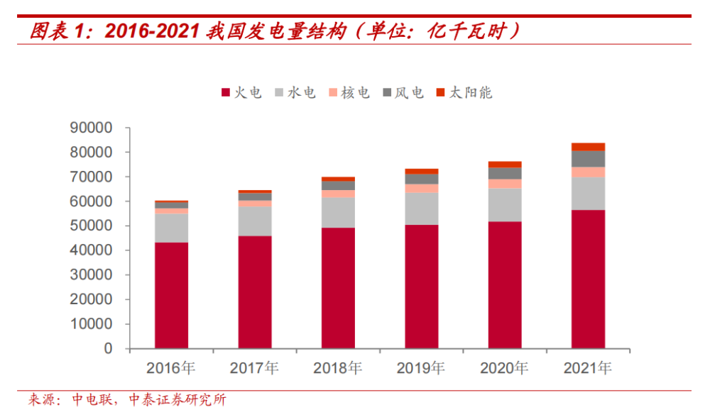 截至2021年,我國風(fēng)電裝機(jī)規(guī)模328.48GW,光伏裝機(jī)規(guī)模 306.56GW。2021年風(fēng)電發(fā)電量為6556億千瓦時,占比7.83%,太陽能發(fā)電量3270億千瓦時,占比3.91%,發(fā)電量合計(jì)占比 11.74%,較2016年的5.10%提升6.64pct。