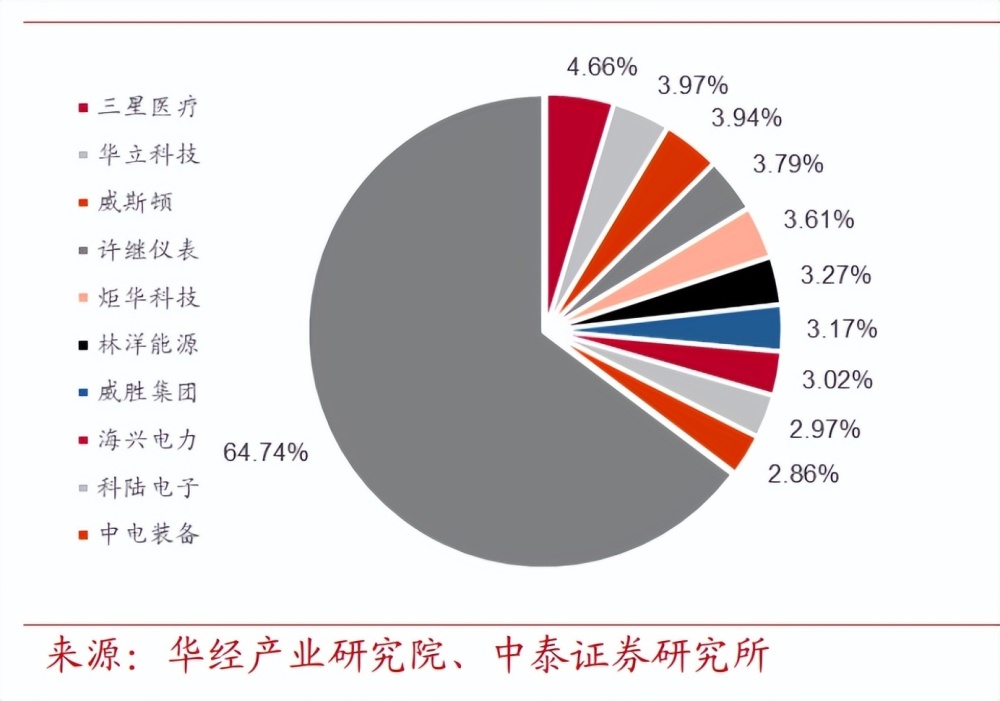 智能電表行業(yè)處于充分競(jìng)爭(zhēng)狀態(tài),市占率穩(wěn)定。參與智能電表及用電信 息集中采集招標(biāo)的企業(yè)數(shù)量較多,國(guó)家電網(wǎng)智能電表及用電信息采集系 統(tǒng)招標(biāo)入圍公司已超過(guò)百家,集中度較低,第一梯隊(duì)三星醫(yī)療、東方威 斯頓、許繼電氣、炬華科技市占率維持在 3%-5%左右。長(zhǎng)期來(lái)看,市場(chǎng) 訂單分散,我國(guó)智能電表行業(yè)競(jìng)爭(zhēng)格局趨于穩(wěn)定。在 2022 年第一批智 能電表中標(biāo)中,三星醫(yī)療、東方威思頓、科陸電子、許繼、華立科技分 別占比 5.1%、4.8%、4.1%、4.1%、4.1%,其中,科陸電子中標(biāo)份額 較 2021 年有較大提升。