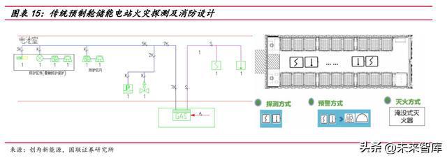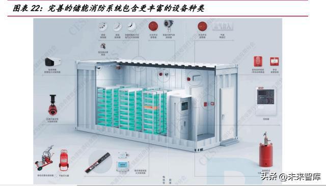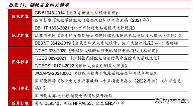 新標(biāo)準(zhǔn)對儲能安全標(biāo)準(zhǔn)提出更高要求。國家標(biāo)準(zhǔn) GB/T 42288-2022《電化學(xué)儲 能電站安全規(guī)程》已正式發(fā)布,將于 2023 年 7 月 1 日起正式實施。此前儲能安全領(lǐng) 域的老國標(biāo)系 2014 年發(fā)布,在消防領(lǐng)域主要規(guī)范了建筑物和設(shè)備防火等級、消防水 池和砂池的配置,探測和預(yù)警方面提出“應(yīng)設(shè)置火災(zāi)自動報警系統(tǒng)”和“宜配置感煙 探測器和可燃氣體報警裝置”。2021 年出臺的新國標(biāo)征求意見稿,開始引入“自動滅 火系統(tǒng)”、“電池模塊級消防”、“多系統(tǒng)聯(lián)動”、“抑制復(fù)燃”等概念。此次新國標(biāo)正式 發(fā)布,相較征求意見稿進一步趨嚴(yán),新增了“每個電池模塊可單獨配置探測器”的表 述;“且防止復(fù)燃”的表述升級為“持續(xù)抑制復(fù)燃”。