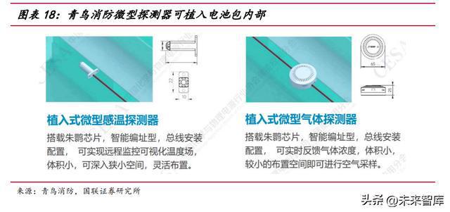 探測端的多層級要求將提升微型探測器的需求。多級防控設(shè)計落實到探測端,體 現(xiàn)在不僅在儲能預(yù)制艙中布設(shè)探測設(shè)備,更需要在每組電池簇,乃至每個電池模塊上, 布設(shè)氣體、溫度探測設(shè)備,以獲得對于隱患位置和發(fā)生時間更清晰的認識,從而進行 更及時精準(zhǔn)的反應(yīng)。
