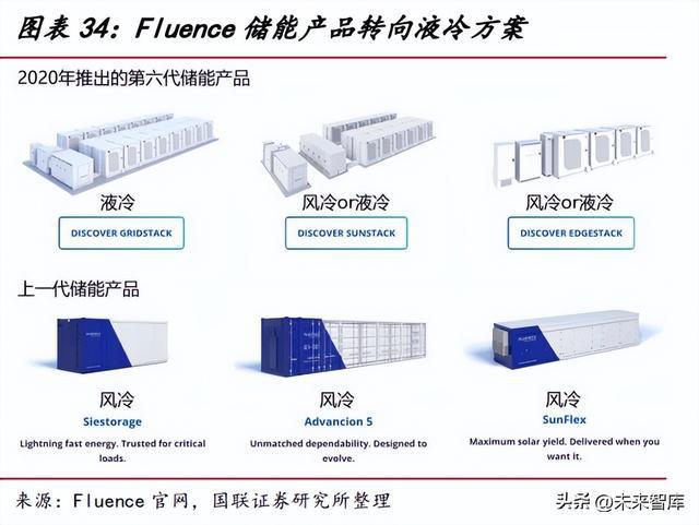 當(dāng)前國內(nèi)儲能液冷滲透率較低,海外市場對液冷接受度較高。據(jù) GGII,2021 年 國內(nèi)儲能領(lǐng)域液冷溫控滲透率僅為 12%,預(yù)計 2025 年有望迅速提升至 45%。海外 市場缺乏統(tǒng)計數(shù)據(jù),但從全球系統(tǒng)集成龍頭 Fluence 的產(chǎn)品結(jié)構(gòu)變化可以看出液冷 滲透率快速提升的趨勢。Fluence 在 2020 年以前的集成產(chǎn)品均為風(fēng)冷方案,2020 年 后推出的新一代產(chǎn)品中,光伏配儲和工商業(yè)儲能產(chǎn)品提供風(fēng)冷和液冷兩種選擇,電網(wǎng) 級儲能產(chǎn)品僅提供液冷配置。