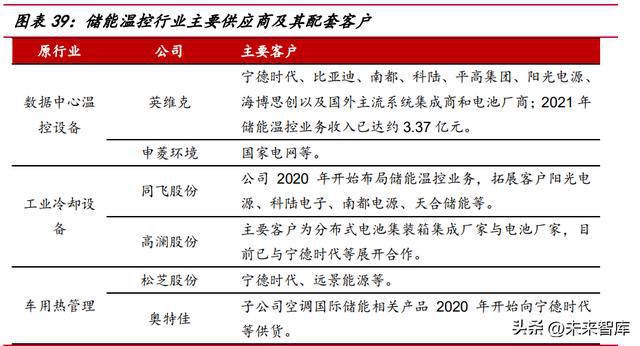 儲能溫控廠商多為相近賽道跨界而來,行業(yè)格局尚不穩(wěn)定。當(dāng)前儲能溫控廠商主 要來自數(shù)據(jù)中心溫控、工業(yè)冷卻設(shè)備和車用熱管理領(lǐng)域,各自的先天優(yōu)勢有部分差異。 一般而言,數(shù)據(jù)中心溫控設(shè)備企業(yè)此前在風(fēng)冷領(lǐng)域技術(shù)積累更多;工業(yè)冷卻設(shè)備企業(yè) 此前對于液冷技術(shù)的應(yīng)用更多;而動力電池?zé)峁芾砥髽I(yè)此前與電池廠商的綁定相對更 深入。目前儲能溫控市場空間相對較小,液冷方案在國內(nèi)剛剛起步,且行業(yè)具備較強 的定制化屬性,競爭格局尚不明確,需關(guān)注溫控廠商與頭部系統(tǒng)集成商的配套關(guān)系。
