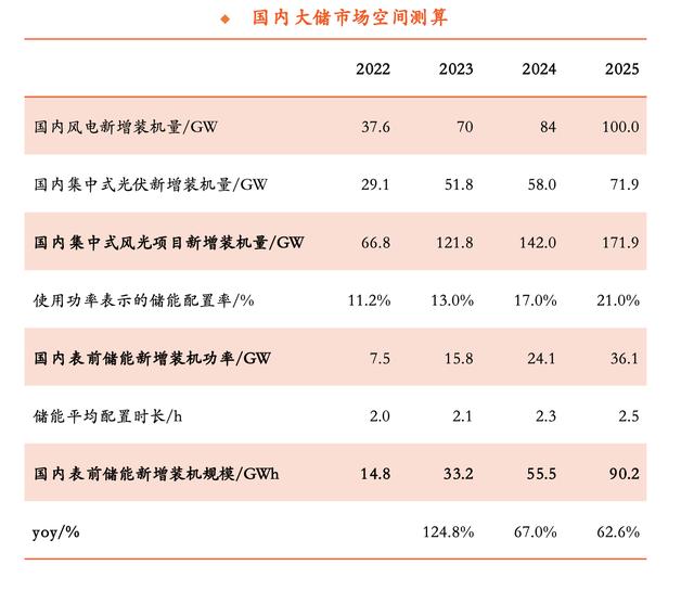 根據(jù)平安證券測算,假設(shè)2023/2024/2025年儲能配置率分別為13%/17%/21%,時長分別為2.1h/2.3h/2.5h。今年國內(nèi)大儲新增裝機有望達到33.2GWh,同比增長124.8%;到2025年,國內(nèi)大儲新增裝機量有望進一步增長至90.2GWh,2022-2025年復(fù)合增長率達83%。