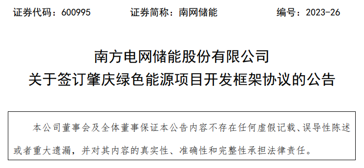 南網(wǎng)儲能于4月22日發(fā)布公告稱,南方電網(wǎng)儲能股份有限公司(乙方)于2023年4月21日與廣東省肇慶市發(fā)展和改革局(甲方)共同簽訂《肇慶綠色能源項(xiàng)目合作開發(fā)框架協(xié)議》。