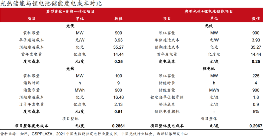 在現(xiàn)行項(xiàng)目配置下,西部證券對(duì)比了“光伏+光熱”和“光伏+鋰電池”兩種項(xiàng)目的經(jīng)濟(jì)性,兩者項(xiàng)目整體的度電成本分別為 0.2861/0.2967 元 /度,光熱的儲(chǔ)能經(jīng)濟(jì)性更高,有利于“十四五”期間裝機(jī)加速發(fā)展。