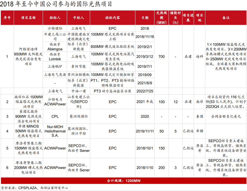 中國(guó)公司光熱技術(shù)已經(jīng)較為成熟,有豐富的出海經(jīng)驗(yàn),據(jù)不完全統(tǒng)計(jì), 2018 年至今中國(guó)公司作為 EPC 方參與的國(guó)際光熱項(xiàng)目規(guī)模合計(jì)達(dá)到 1200MW,占比達(dá)到 1/6。