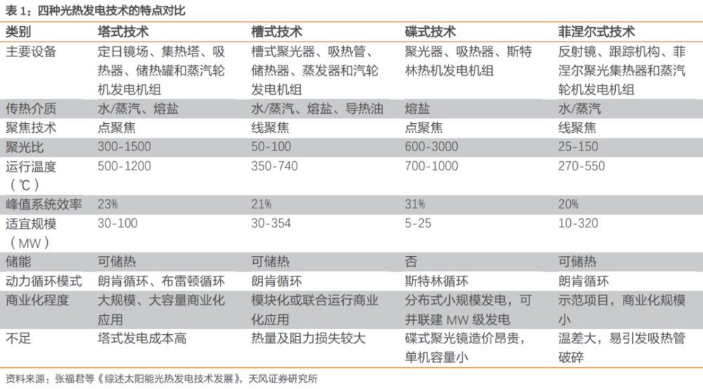 在各種形式的光熱發(fā)電技術(shù)中,塔式熔鹽儲(chǔ)能光熱發(fā)電因其較高的系統(tǒng)效率,成為目前我國(guó)最主流的光熱發(fā)電技術(shù)路線,但其發(fā)電成本較高。天風(fēng)證券認(rèn)為,隨著未來(lái)技術(shù)的發(fā)展,成本有較大的下降空間。