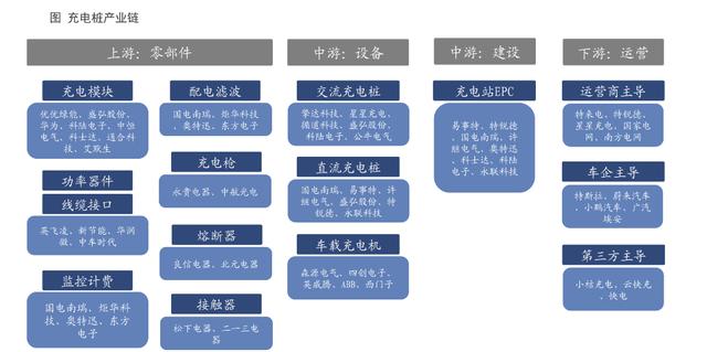 再來拆下充電樁的產(chǎn)業(yè)鏈,充電樁的產(chǎn)業(yè)鏈很簡(jiǎn)單,上游是零部件、中游是設(shè)備加工制造,再到下游運(yùn)營(yíng)環(huán)節(jié)。