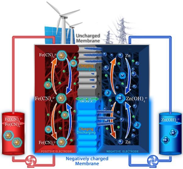 鋅鐵液流電池選用礦藏儲量豐富且價格穩(wěn)定的鋅、鐵元素組成配對,依靠鋅酸鹽離子和鐵離子之間的電化學反應來實現電能的儲存和釋放,采用堿性電解液,擁有零爆炸零燃燒的特性,電池放電次數超過20000次,使用壽命超過20年,在額定功率輸出下,放電時長超過8小時。
