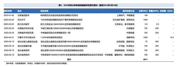 聯(lián)儲證券統(tǒng)計顯示,2022年國內(nèi)已投運的釩電池新型儲能項目裝機規(guī)模為0.2GW。截至2023年5月第三周,國內(nèi)已招標(biāo)釩液流電池系統(tǒng)項目6個,合計招標(biāo)功率超過44MW,參與投資的企業(yè)多為上海電氣(601727.SH)、華潤電力(00836.HK)、國家電投等國企。