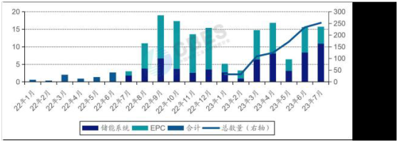 中國電池工業(yè)協(xié)會儲能分會近日發(fā)布的2023中國新型儲能7月研究簡報顯示,儲能市場持續(xù)火熱,7 月儲能系統(tǒng)招標(biāo)規(guī)模創(chuàng)歷史新高。分會共統(tǒng)計到儲能招標(biāo)項目252個,總規(guī)模達(dá)到15.8GWh ,環(huán)比增長1% ,同比增長425% 。其中,儲能EPC項目共計171個,規(guī)模為4.9GWh ,儲能系統(tǒng)項目共計81個,規(guī)模為10.9GWh。