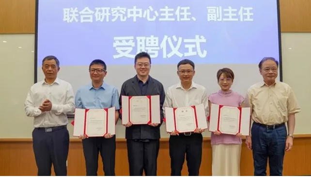 中國(guó)科學(xué)院院士馬余剛(左一)、褚君浩(右一)為聯(lián)合研究中心負(fù)責(zé)人頒發(fā)聘書