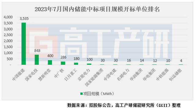 從開標單位來看,7月份主要涉及有中國能建、國家電投、慧新明堂、中廣核、日月重工、京能電力、國家能源集團、中國電建、名湖電力、華潤集團、華電集團、中核能源、恒運儲能。其中,中國能建以3.5GWh開標規(guī)模排名第一,市場占比64.7%。其次為國家電投、慧新明堂分別占比15.5%和7.3%。