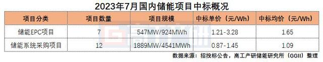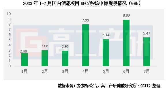 智通財經(jīng)獲悉,依據(jù)GGII發(fā)布的《高工儲能行業(yè)數(shù)據(jù)庫》不完全統(tǒng)計,2023年7月國內(nèi)共有19個儲能項目EPC/系統(tǒng)公布中標結(jié)果,規(guī)模合計2.44GW/5.47GWh,中標數(shù)量和裝機容量分別較上月下降30%和38%。