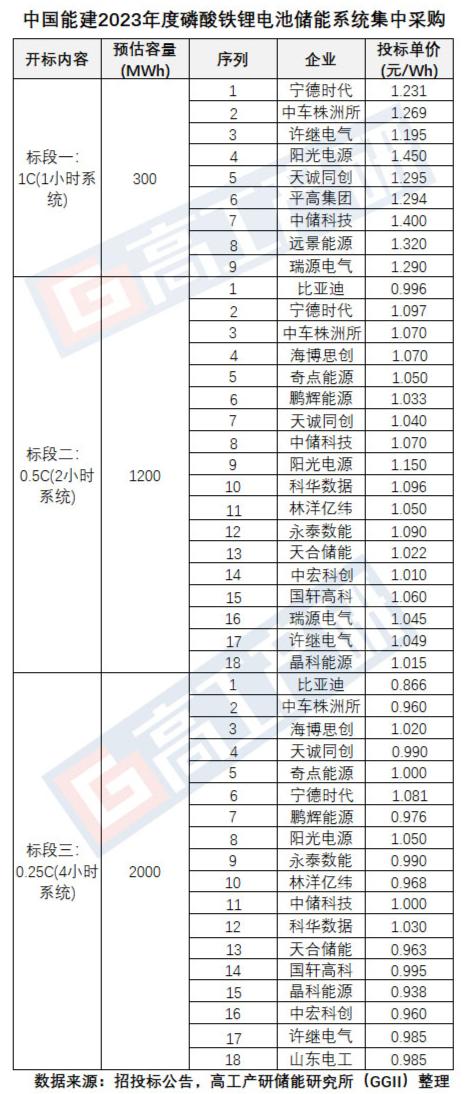 值得關(guān)注的是,7月18日,中國能建2023年度磷酸鐵鋰電池儲能系統(tǒng)集中采購開標。本次集采共分為3個標段,總采購量3.5GWh,項目主要分布于全國,共有21家儲能企業(yè)入圍。