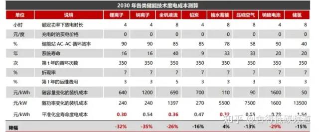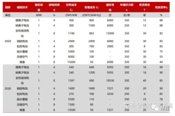 為了對比各類儲能技術(shù)度電成本的變化趨勢,首先對各類技術(shù)到 2030 年的儲 能容量、能量單元成本、使用壽命、充放電效率等進行假設(shè):