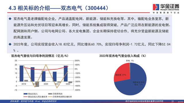 雙杰電氣是老牌輸配電企業(yè),產(chǎn)品涵蓋配電網(wǎng)、新能源、儲能和充換電等。其中,輸配電業(yè)務(wù)復(fù)蘇,新能源升壓站和光伏項目等迎來高增長。同時,儲能系統(tǒng)集成取得突破,產(chǎn)品廣泛應(yīng)用在新能源的發(fā)電側(cè)、配網(wǎng)測和用戶側(cè)。公司與電網(wǎng)公司、各大發(fā)電集團(tuán)、企業(yè)長期保持密切合作,將充分受益新能源及儲能的高速發(fā)展。2022年度,公司實現(xiàn)營業(yè)收入18.82億元,同比增長60.70%,實現(xiàn)歸母凈利潤-1.72億元,同比下降52.04% 。