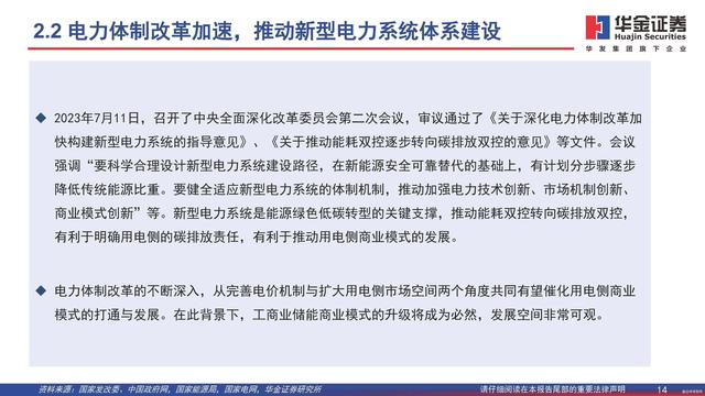 2023年7月11日,召開了中央全面深化改革委員會第二次會議,審議通過了《關(guān)于深化電力體制改革加快構(gòu)建新型電力系統(tǒng)的指導(dǎo)意見》、《關(guān)于推動能耗雙控逐步轉(zhuǎn)向碳排放雙控的意見》等文件。會議強(qiáng)調(diào)“要科學(xué)合理設(shè)計新型電力系統(tǒng)建設(shè)路徑,在新能源安全可靠替代的基礎(chǔ)上,有計劃分步驟逐步降低傳統(tǒng)能源比重。要健全適應(yīng)新型電力系統(tǒng)的體制機(jī)制,推動加強(qiáng)電力技術(shù)創(chuàng)新、市場機(jī)制創(chuàng)新、商業(yè)模式創(chuàng)新”等。新型電力系統(tǒng)是能源綠色低碳轉(zhuǎn)型的關(guān)鍵支撐,推動能耗雙控轉(zhuǎn)向碳排放雙控,有利于明確用電側(cè)的碳排放責(zé)任,有利于推動用電側(cè)商業(yè)模式的發(fā)展。