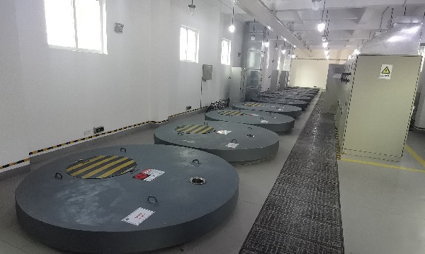 距離儲能電站不遠的飛輪儲能項目,是國內首個投入運行的與百萬千瓦級中間二次再熱火電機組聯(lián)合調頻項目,也是國內首個室內飛輪儲能項目。記者在廠房看到,10個直徑2米左右的井蓋依次排列,打開地井就看到了外形類似豎立大桶的磁懸浮飛輪儲能裝置。