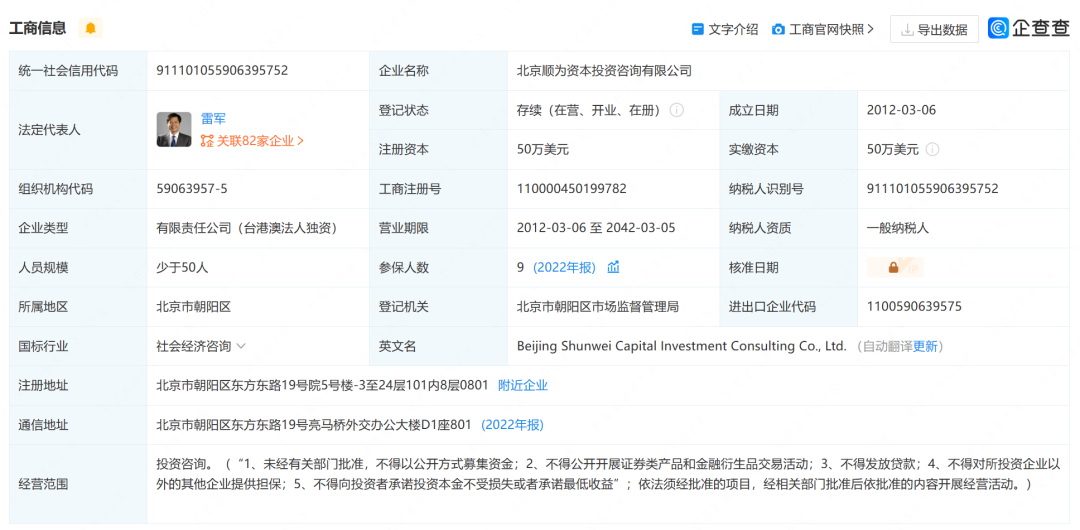 資料顯示,順為資本的機構(gòu)主體是北京順為資本投資咨詢有限公司,由雷軍先生和許達(dá)來先生創(chuàng)立于2011年,法定代表人為小米集團(tuán)董事長雷軍。