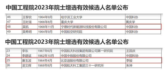 比亞迪首席科學(xué)家廉玉波由中國工程院院士李駿提名推薦,寧德時代首席科學(xué)家吳凱由中國科協(xié)提名推薦。