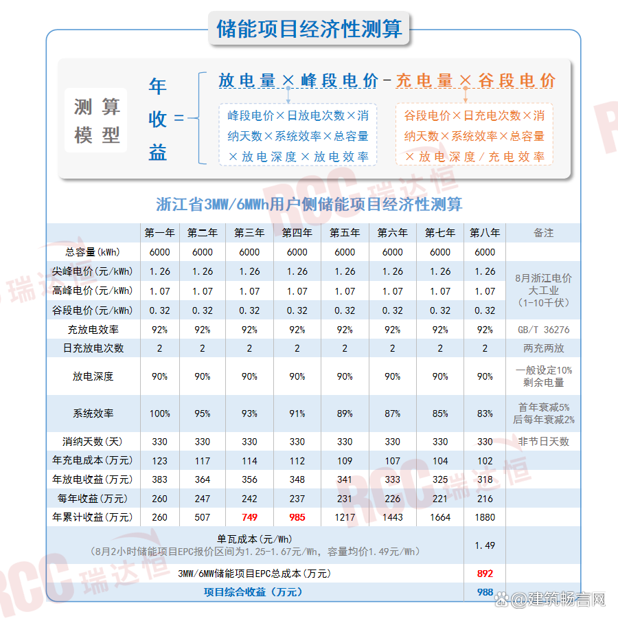 RCC瑞達(dá)恒研究院基于8月份的電價及儲能項(xiàng)目EPC中標(biāo)均價等數(shù)據(jù),以浙江省某化纖生產(chǎn)公司3MW/6MW的用戶側(cè)儲能項(xiàng)目為例進(jìn)行經(jīng)濟(jì)性測算得出:該項(xiàng)目約3.5年便可回收項(xiàng)目建設(shè)成本,按項(xiàng)目運(yùn)行周期8年測算,項(xiàng)目可為業(yè)主節(jié)省988萬元的電費(fèi)。