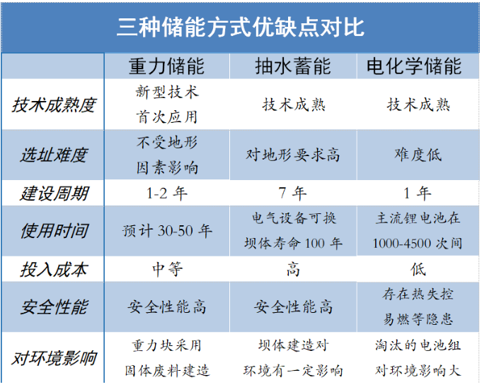 目前大家常聽到的儲能方式有「抽水蓄能」「化學(xué)儲能」,三者各有各的特點,咱們一先看一張表。