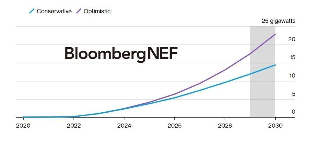 圖:中國液流電池裝機規(guī)模預測(彭博新能源財經(jīng))