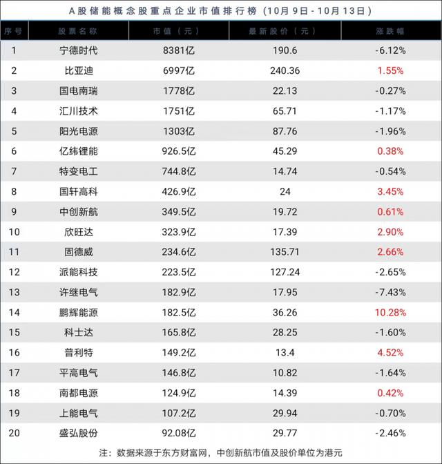 上周(10月9日-10月13日),東方財富儲能概念板塊微增0.39%,漲勢已持續(xù)3周。在《華夏時報》重點關(guān)注的20家上市儲能企業(yè)中,有9家上漲,11家下跌。鵬輝能源以10.28%的幅度領(lǐng)漲,普利特、國軒高科、欣旺達(dá)、固德威、比亞迪、南都電源、億緯鋰能和中創(chuàng)新航分別上漲了4.52%、3.45%、2.90%、2.66%、1.55%、0.42%、0.38%和0.61%。