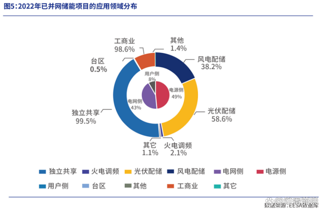 儲能下游的應(yīng)用場景可分為電源側(cè)(又稱發(fā)電側(cè))、電網(wǎng)側(cè)和用戶側(cè)。據(jù)《2023年中國新型儲能產(chǎn)業(yè)發(fā)展白皮書》統(tǒng)計,從2022年已并網(wǎng)儲能項目應(yīng)用領(lǐng)域來看,電源側(cè)、電網(wǎng)側(cè)、用戶側(cè)項目分布比例分別是49%、43%和8%。具體來看,光伏配儲和風(fēng)光配儲又分別占電源側(cè)項目的58.6%和38.2%,也就是配儲合計占電源側(cè)項目的96.8%。