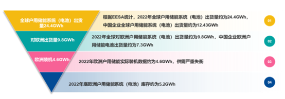 根據(jù)國內(nèi)產(chǎn)業(yè)機構(gòu)EESA統(tǒng)計,2022年全球戶用儲能系統(tǒng)(電池)出貨量約為24.4GWh,其中對歐洲戶用儲能市場出貨量達到約9.8GWh;然而,2022年歐洲戶用儲能實際裝機4.6GWh,僅2022年底歐洲戶用儲能系統(tǒng)(電池)庫存約為5.2GWh。