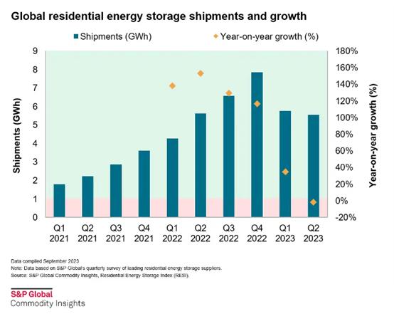 根據(jù)S&P Global Commodity Insights數(shù)據(jù),2023年Q2,全球戶用儲能出貨量較Q1下降了2%,這是戶儲有統(tǒng)計數(shù)據(jù)以來的第一次。