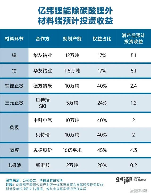據(jù)華福證券預(yù)測(cè),2022年億緯鋰能碳酸鋰可自供量約為2779噸,自供比列約為14%,未來還將逐年快速提升,至2024年其碳酸鋰自供比例將升至33%,根據(jù)其長遠(yuǎn)產(chǎn)能規(guī)劃,未來很可能達(dá)到49%;而億緯鋰能在上游鈷鎳、正負(fù)極材料、隔膜以及電解液等材料領(lǐng)域的產(chǎn)業(yè)布局一旦滿產(chǎn)后,預(yù)計(jì)合計(jì)將實(shí)現(xiàn)22.3億元的投資收益。
