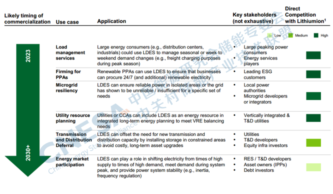 從應(yīng)用場(chǎng)景上講,LDES在用電負(fù)荷管理,電力購(gòu)買協(xié)議,微網(wǎng)韌性和電力資源規(guī)劃等應(yīng)用場(chǎng)景與鋰電有較強(qiáng)的競(jìng)爭(zhēng)關(guān)系,而在推遲輸配電網(wǎng)建設(shè)和參加電力市場(chǎng)方面的競(jìng)爭(zhēng)關(guān)系相對(duì)較弱。