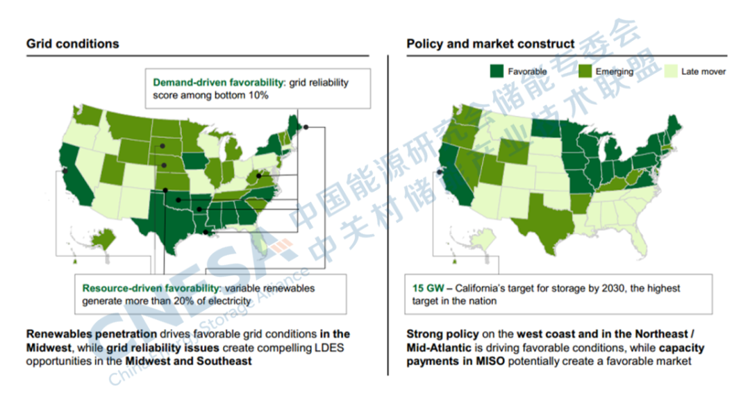 在美國(guó)由于不同的電網(wǎng)條件、政策和市場(chǎng)結(jié)構(gòu),LDES部署的就緒程度各不相同。報(bào)告指出:有兩個(gè)因素可以用來評(píng)估市場(chǎng)LDES的就緒程度:電網(wǎng)條件、政策和市場(chǎng)結(jié)構(gòu)。一是電網(wǎng)條件。衡量LDES在特定狀態(tài)下的可獲得性和相對(duì)可行性,以及整體發(fā)電組合。影響因素包括間歇性可再生能源的滲透率百分比、輸配電投資缺口、SAIDI/SAIFI得分衡量的電網(wǎng)彈性以及互聯(lián)的難易程度。二是政策和市場(chǎng)結(jié)構(gòu)。衡量地方政策和收入結(jié)構(gòu)對(duì)在該州部署具有有利風(fēng)險(xiǎn)調(diào)整回報(bào)預(yù)期的LDES的有利程度。影響因素包括可再生能源投資組合標(biāo)準(zhǔn)(RPSs)、是否有容量支付以及支付的水平等。通過評(píng)估,可以得出加利福尼亞、德克薩斯、紐約、緬因州、愛荷華州和康涅狄格州在近期內(nèi)具有很高的潛力(圖8)。